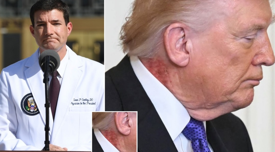 White House Doctor breaks silence on the new noticeable rotting rash-like mark on Trump’s neck during an event in newly released photo, exposing the reason for the bruising on his hands, swollen ankles and rashes on his neck… it’s getting bad!